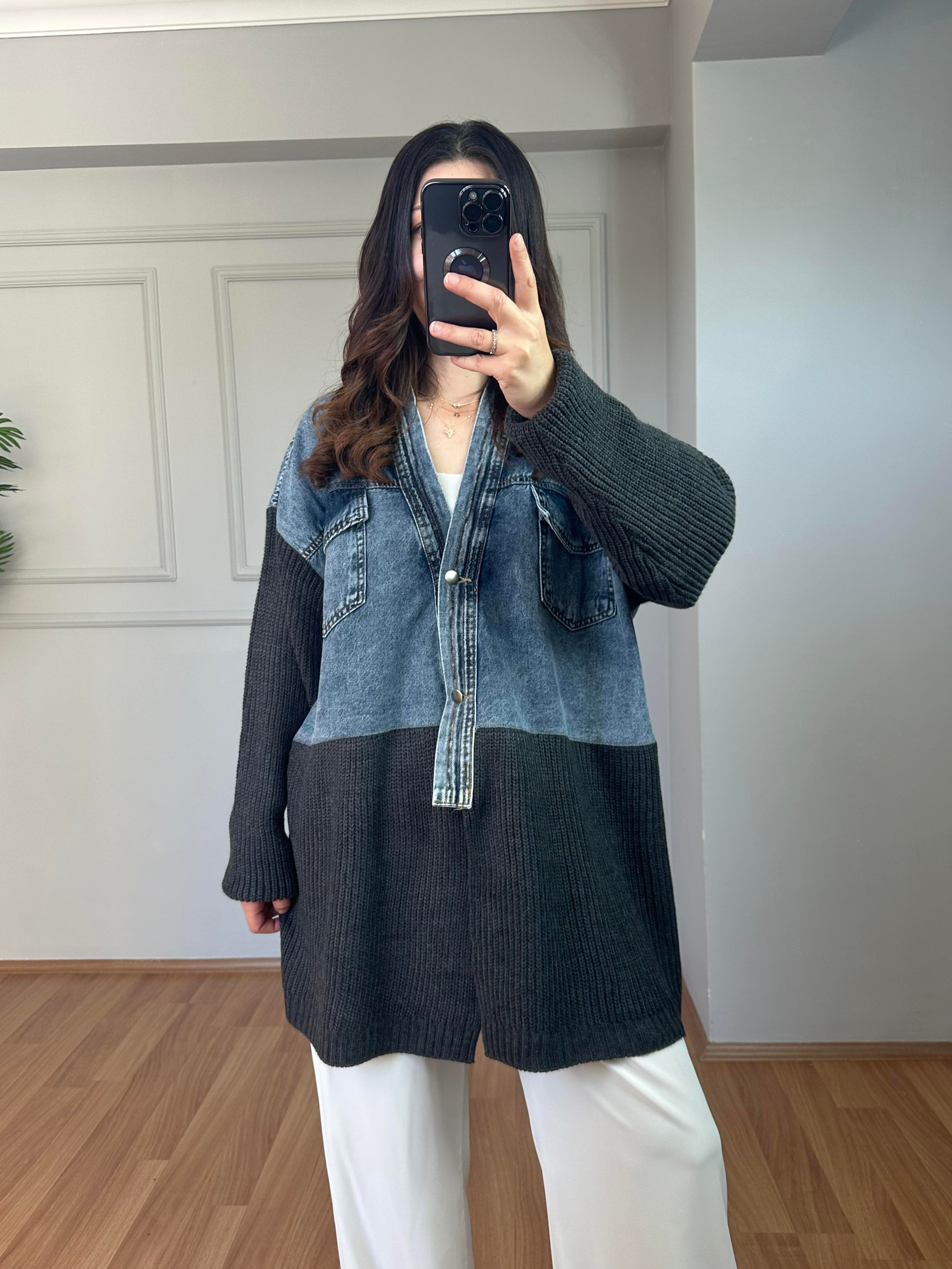 Sara Antrasit Tasarım Denim Detaylı Hırka
